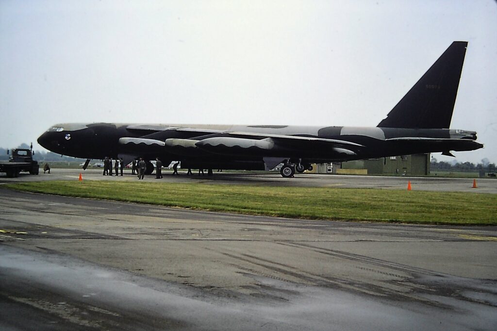 According to ‘Air The Journal of West London Aviation Group’ Oct 1988 – ‘The 7 42ndBW B-52G’s arrived on 29.7 to take part in Exercise “Mighty Warrior”. Unusual for this exercise was the amount of aircraft flying double missions in any one day. It was common for an aircraft to depart at 0830, recover at 1220, be refuelled and leave again around 1550 to arrive back around 1730. This has happened on previous deployments but not on this scale. Their missions were over an island off the Dutch / Belgian coast, where two live bombs were dropped on each mission. B-52G 80225 did no flying on any mission. On it’s way from Loring to Fairford, the heating elements in the windscreen failed causing the outer screen to crack and literally blow off the wipers. Another windscreen was ordered from the States, but was “lost” in transit. The Crew Chief of 80225 interestingly stated that this particular aircraft is the only B-52 in the world never to have suffered a bomb “hang-up”. The aircraft also, unusually, used a different call-sign each day during the exercise, some of them being “Cara”, “Genie”, “Emil” and “Noun”.